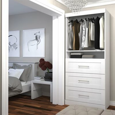 This shelving unit by Bestar® will add storage and sophistication to any room in your home. This unit features open adjustable shelving and three integrated drawers. Shaker-inspired trim and metal handles on drawers. Two clothing rods included.