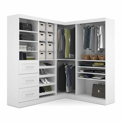 Pur by Bestar 82-in Corner Kit 25-in 3 drawer/open shelves unit and the 36-in open shelves unit have 2 fixed and 3 adjustable shelves to maximize your options 2 clothing rods are included with the 36-in unit Drawers are mounted on ball-bearing slides for smooth and silent operation Shaker-inspired trim and metal handles on drawers Multi-storage unit has 8 cubby compartments and 4 slanted shelves Corner unit has 1 shelf and 2 poles to hang clothes Includes: Corner Storage Unit: 32.3-in Wide x 32.3-in Back To Front x 83.7-in High 36-in Open Shelves Storage Unit: 35.8-in Wide x 18.2-in Back To Front x 83.7-in High 25-in Multi-Storage Cubby Unit: 25-in Wide x 18.2-in Back To Front x 83.7-in High 25-in 3 Drawer/Open Shelves Storage Unit 25-in Wide x 18.2-in Back To Front x 83.7-in High 3 Drawers: 21.5-in Wide x 15-in Back To Front x 8.9-in High (each)