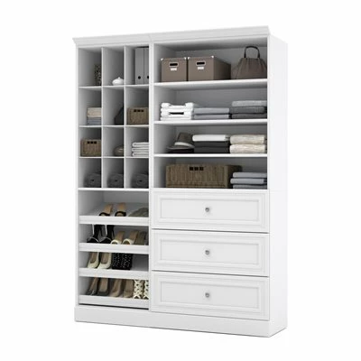 Versatile by Bestar 61-in 3 Drawer/Multi-Storage Classic Kit Durable 1.9-cm (0.75-in) shelves with a burn-, scratch- and stain-resistant finish melamine Finished with attractive molding 36-in storage unit has 2 fixed and 3 adjustable shelves and 2 poles to hang clothes Drawers are mounted on ball-bearing slides for smooth and silent operation Satin nickel drawer pulls 25-in cubby unit features 12 cubby compartments and 4 slanted shelves Stores up to 24 pairs of shoes Easy to install Assembly required Includes: 36-in 3 Drawer/Open Shelves Storage Unit: 35.8-in Wide x 20-in Back To Front x 85-in High 25-in Cubby Storage Unit: 25-in Wide x 20-in Back To Front x 85-in High