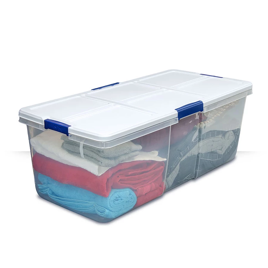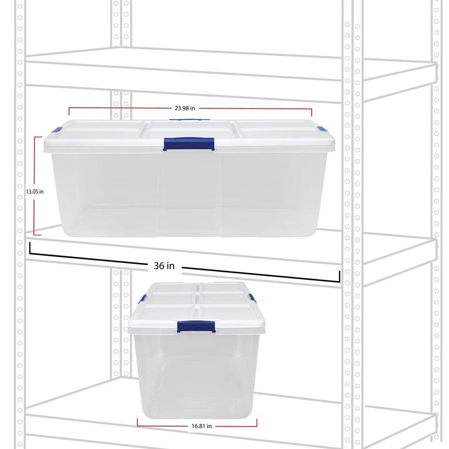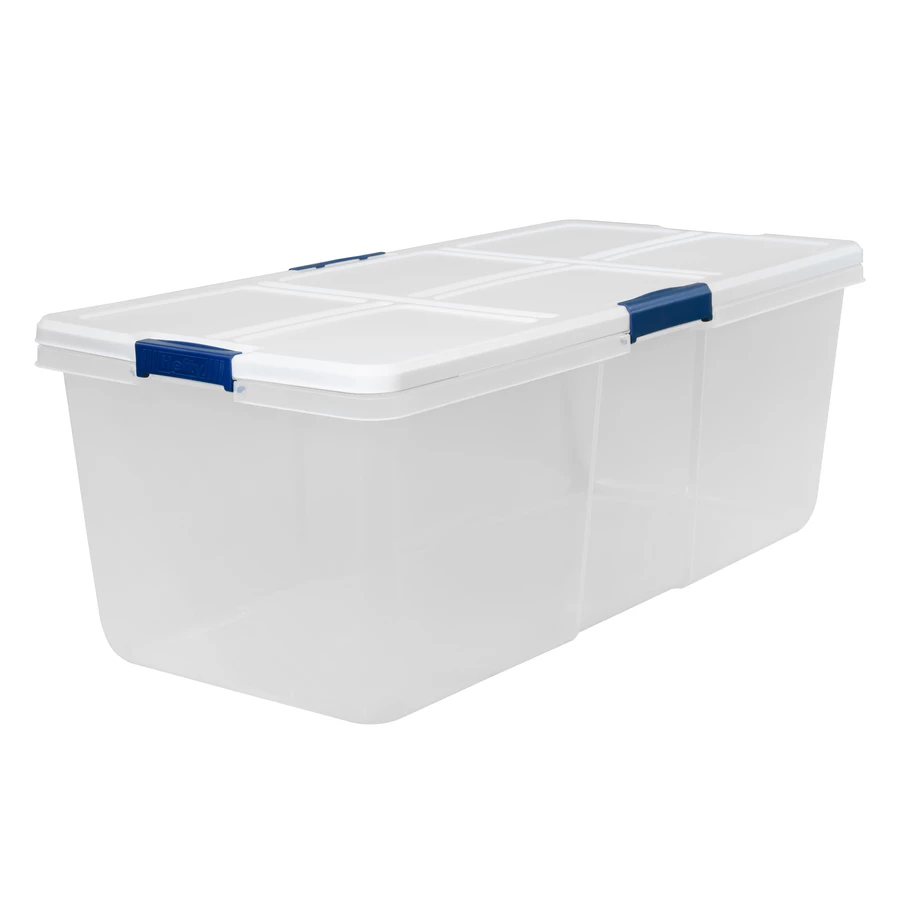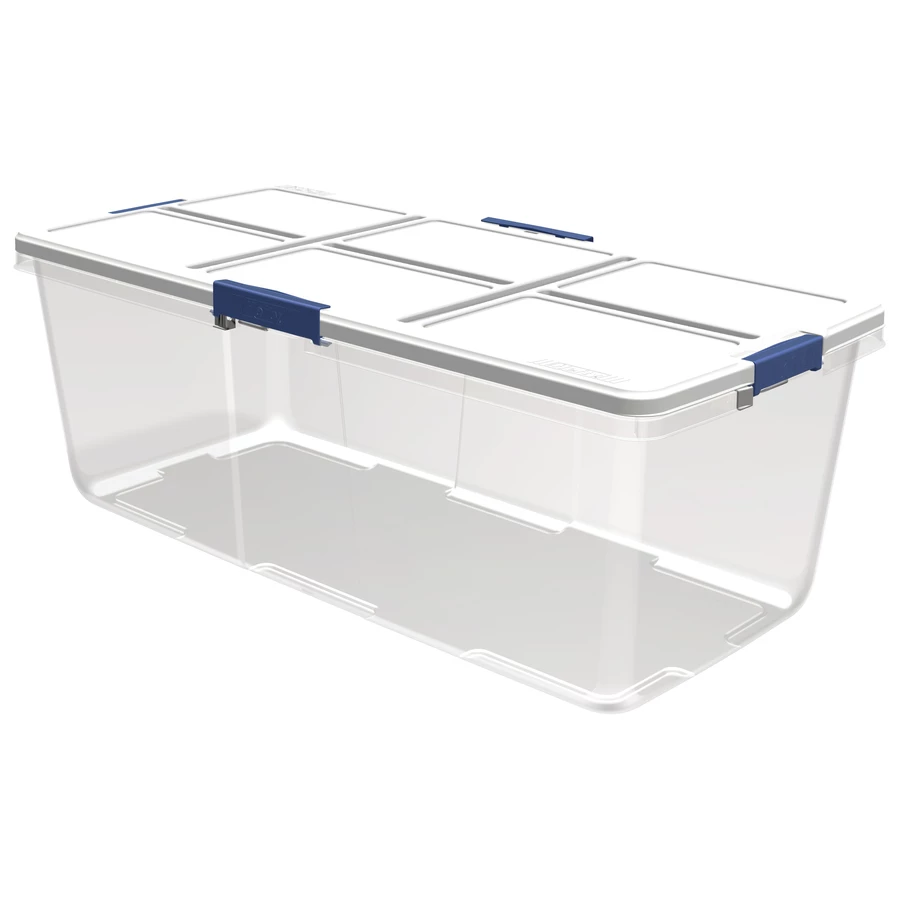 - Latched handles close the lid tightly, allowing you to store this tote in a garage, attic or shed