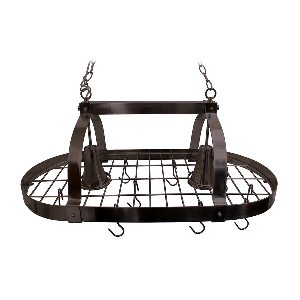 This pot rack from Home Collection features 10 hooks and 2 lights. It is made of metal with an oil rubbed bronze finish.