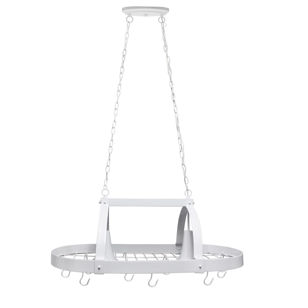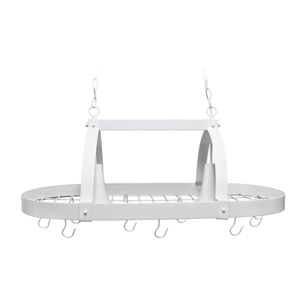 This pot rack from Home Collection features 10 hooks and 2 lights. It is made of metal with a white finish.