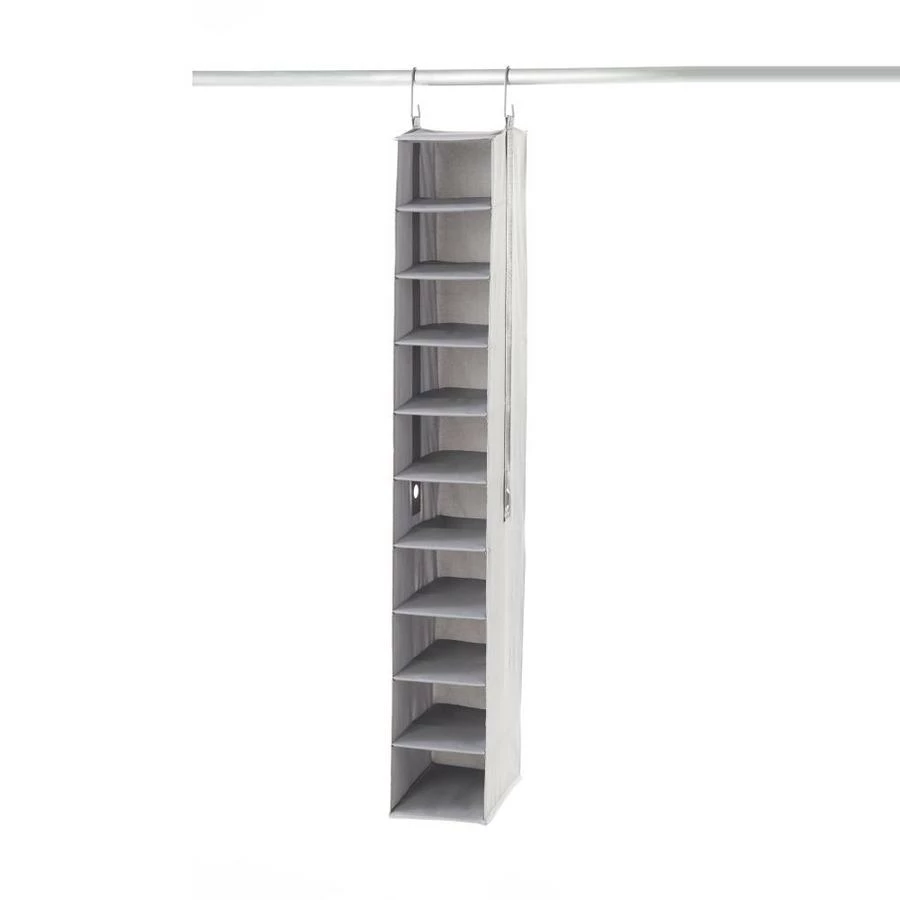 Add usable storage to your closet instantly with this neatfreak(R) closet shoe organizer. Simple to install, the closet organizer hangs from any closet bar with heavy-duty hooks. It features a top shelf for loose items and 10 large reinforced shelves that are ideal for storing shoes, hats, purses and more. The hanging closet organizer is made with polyester fabric that can be easily wiped clean. The Harmony Twill pattern and grey colour pair perfectly with any décor setting, and storage boxes and drawers can be added for a coordinated look (sold separately).