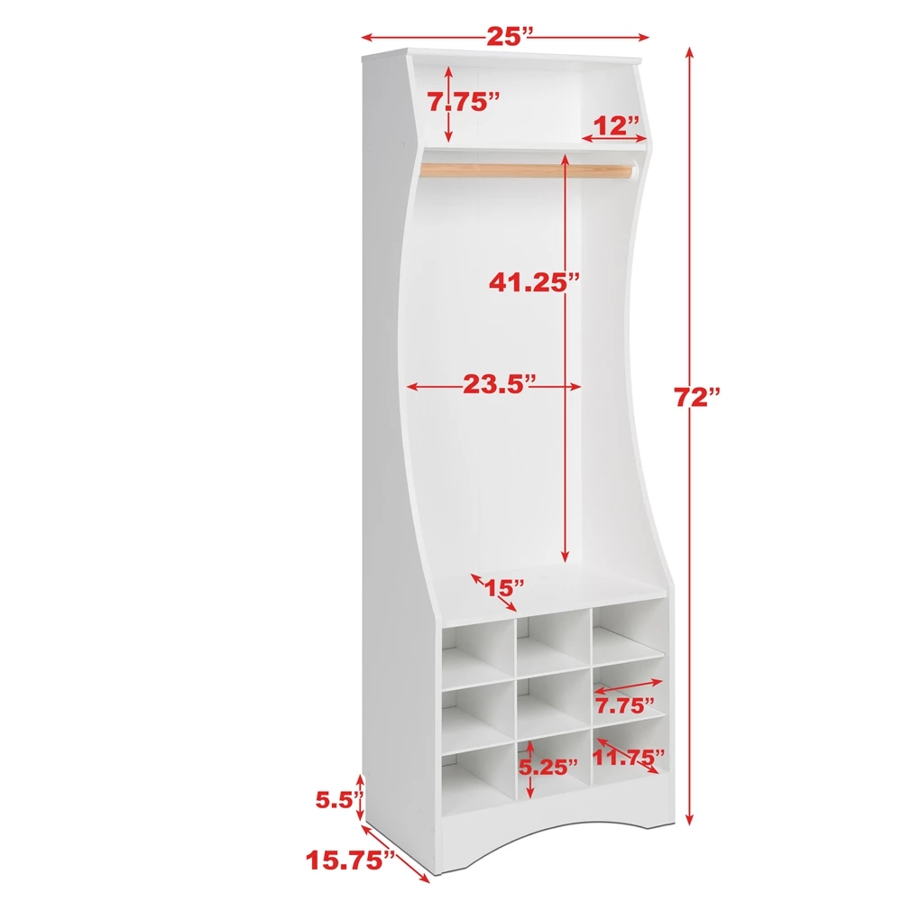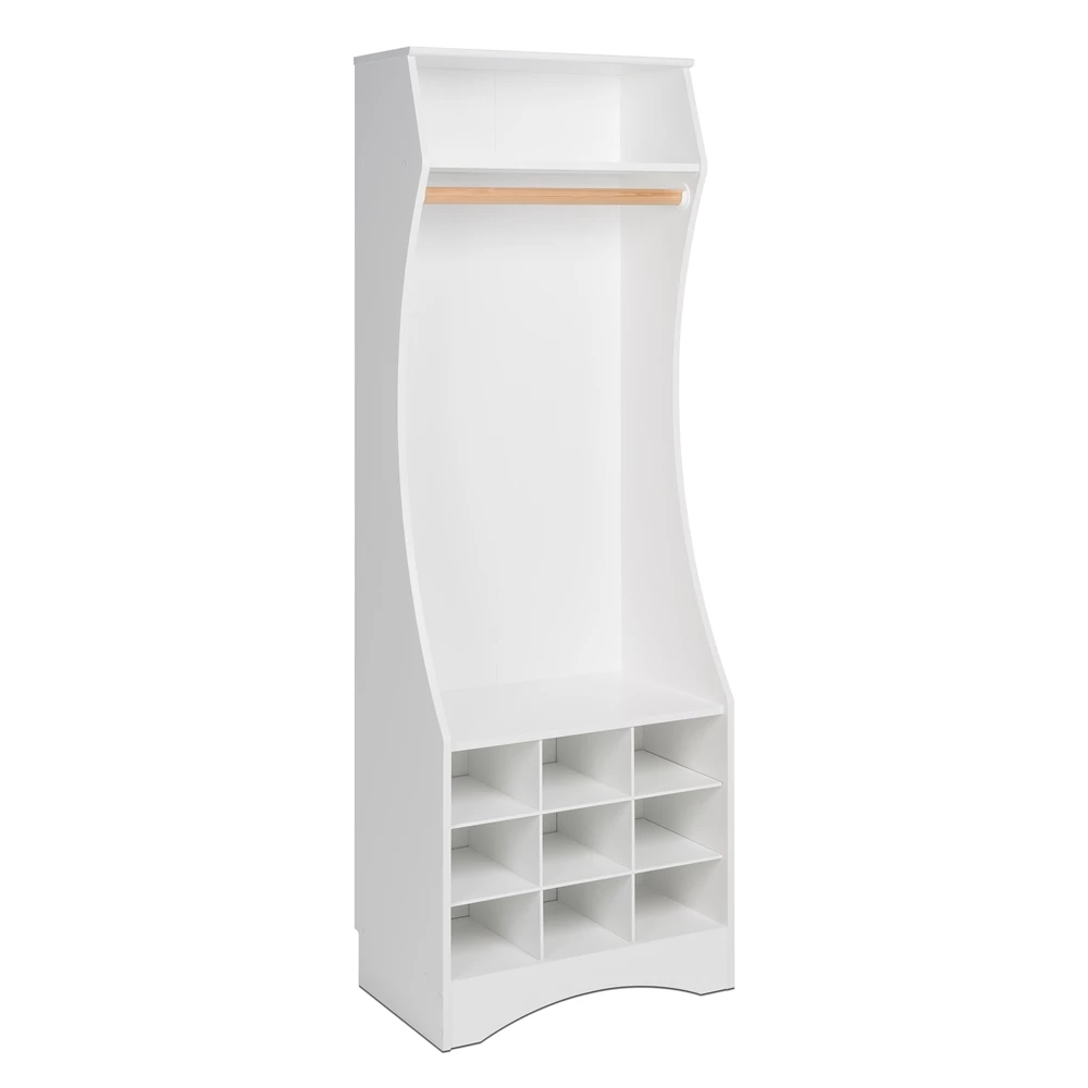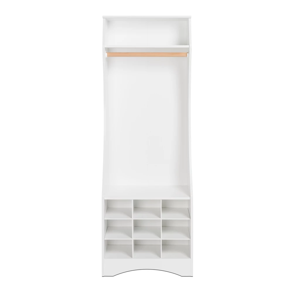 Store your clothes and shoes in one convenient place with the Prepac Compact Wardrobe with Shoe Storage. Contoured edges give the open wardrobe a modern look, and its minimalist design allows it to fit in compact spaces. Hang your jackets, shirts and scarves on the wooden rod, and store your shoes in the 9 shoe cubbies below. The wardrobe has an additional shelf at the top which is great for hats, gloves, keys and any extra belongings. The baseboard cut-out in the back, allows the wardrobe to be pushed right up against the wall. If room permits, multiple units can be placed side by side. Finished in fresh white laminate, this compact wardrobe with shoe storage will help your home be stylish and more organized.