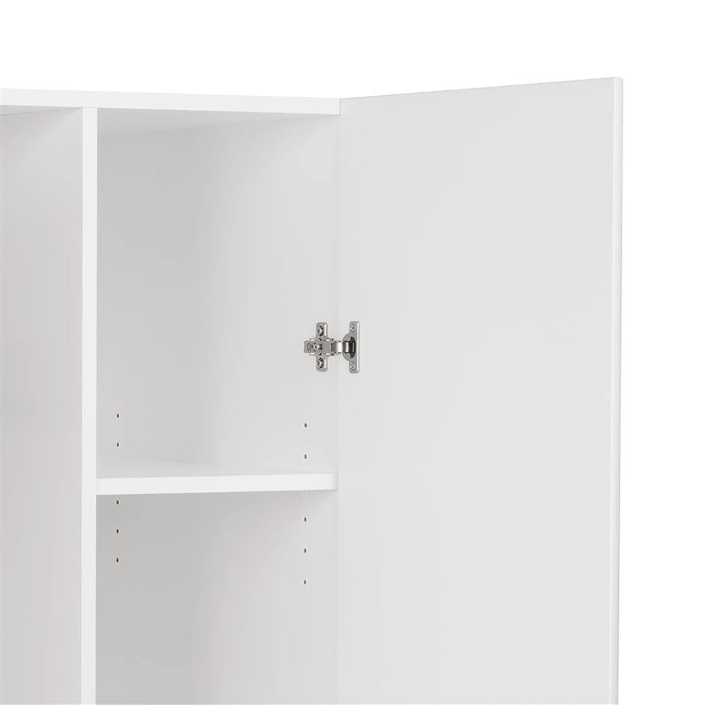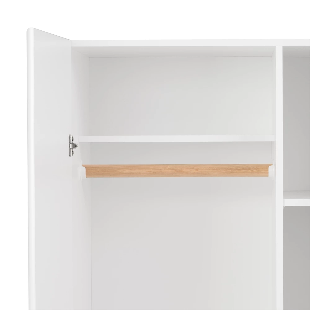 Storage never goes out of style and the Elite wardrobe cabinet with storage is the ideal, multifunctional cabinet for busy households. Combining an armoire and a shelving unit, it fits everyone’s needs. The wardrobe side includes a 19-in wide dowel for hanging clothes, with a compartment height of 42.5-in making it just the right height for button-up dress shirts and blazers. Fixed shelves above and below create compartments where you can stash hats, shoes, totes, blankets or boxes containing any assortment of objects imaginable. On the right side is a compartment with one fixed and two adjustable shelves which are ideal for storing just about anything. All of this behind MDF doors with soft rounded edges and modern handles.