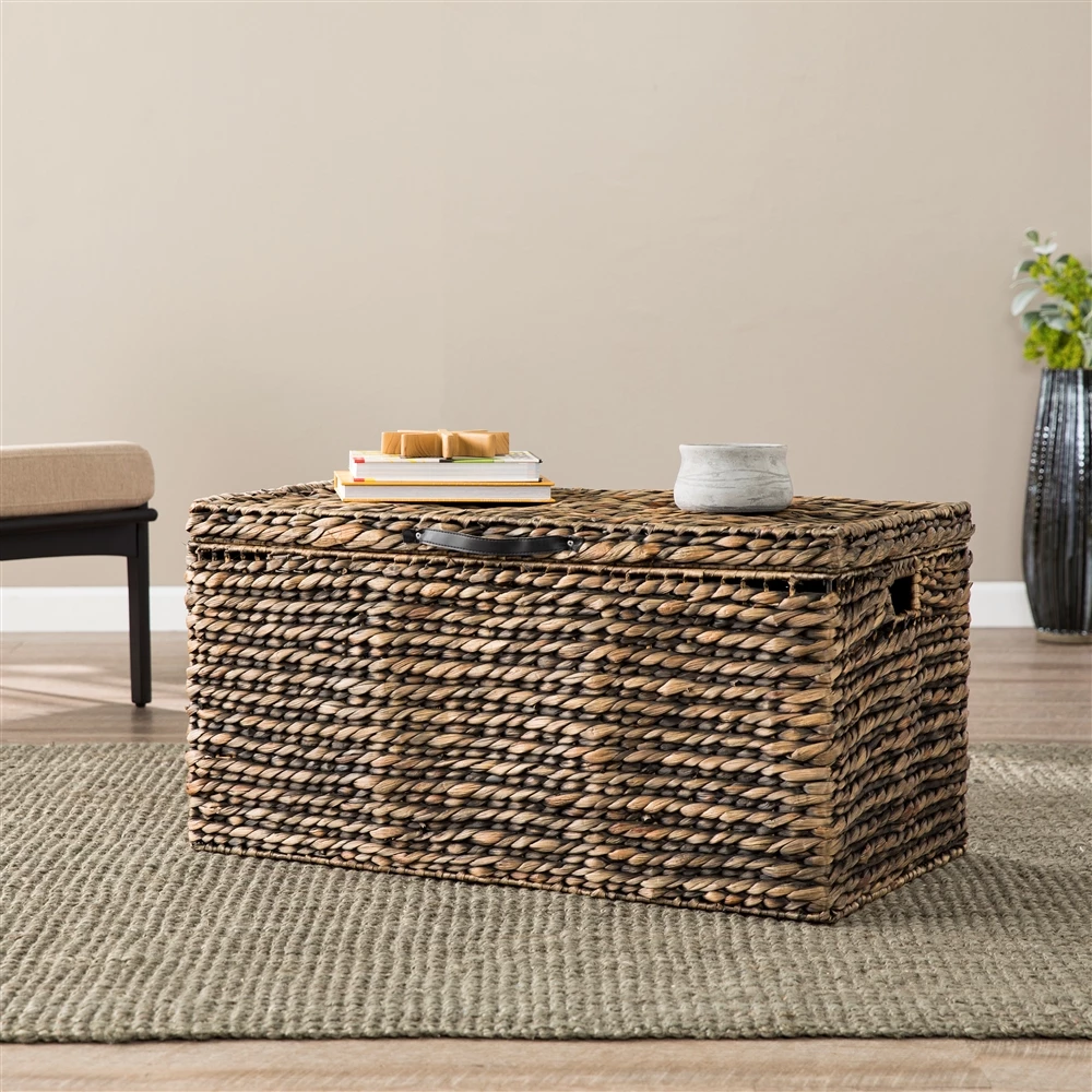 This natural trunk table offers subtle storage to your lounge area or bedside, holding your extra blankets, pillows or board games. Its natural espresso-washed water hyacinth gives your home a coastal feel.