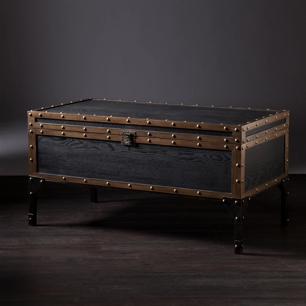 Make a statement in your home with this industrial trunk table. An antique black finish and dark antique bronze details give this beautiful piece an air of worldly sophistication. It is perfect for storing living room accessories like blankets or board games.