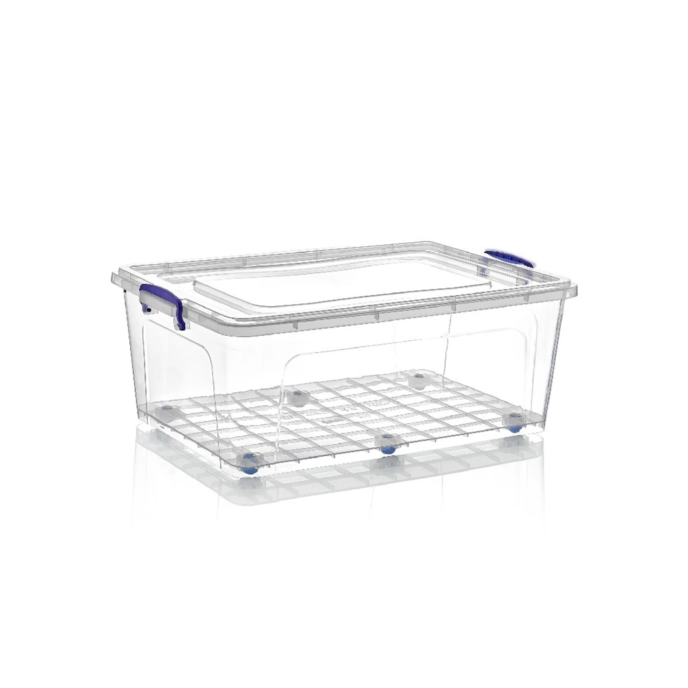 This stackable, space-efficient 58.7-L storage box makes organizing simple and easy. Use it in your basement, garage, boat, camper, and more. Ensure your shoes, food, arts and crafts material, yarns, or toys remain dust-free and clean with this handy container box. See-through base for easy identification of contents. Snap-tight lid keeps contents secure.