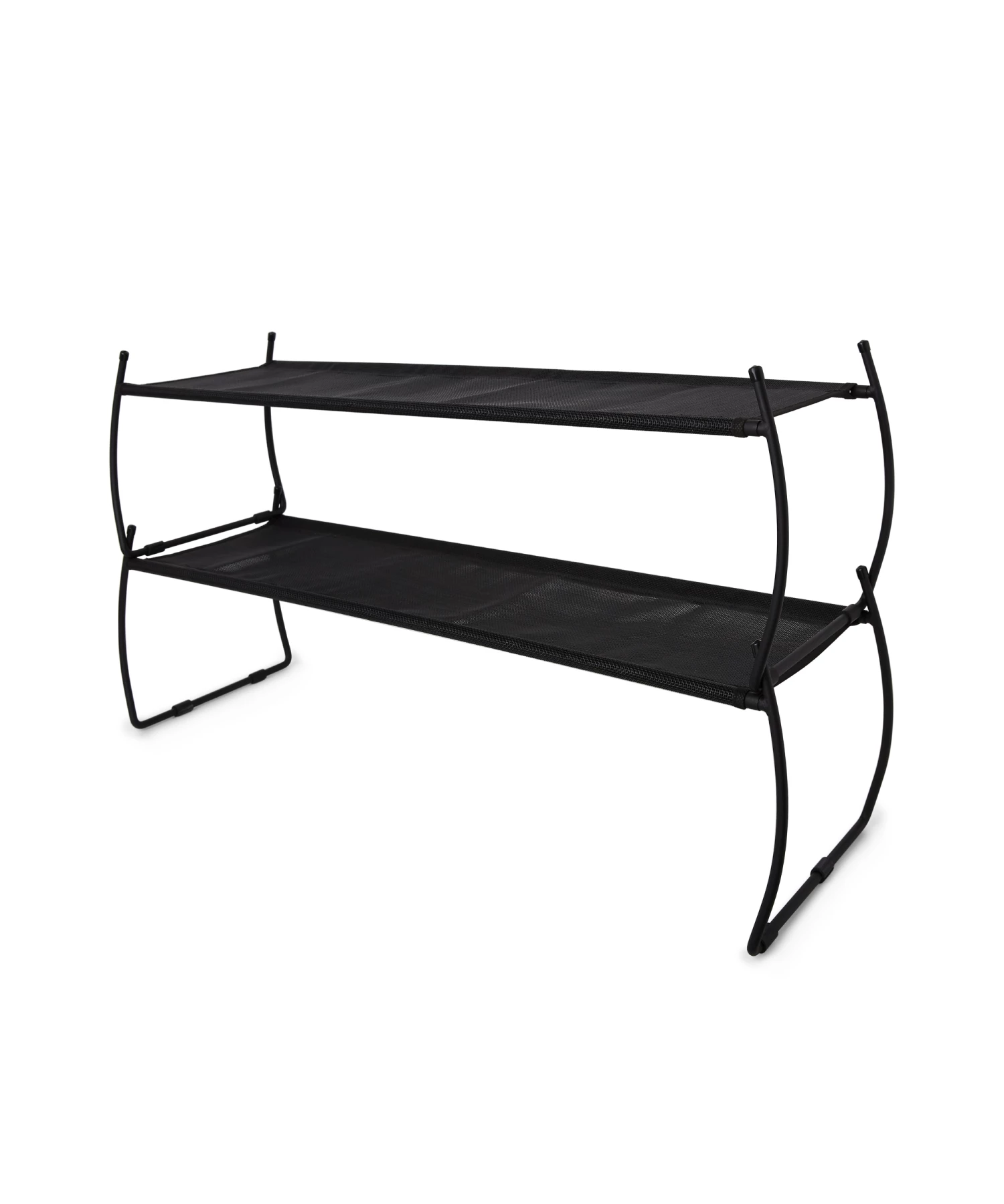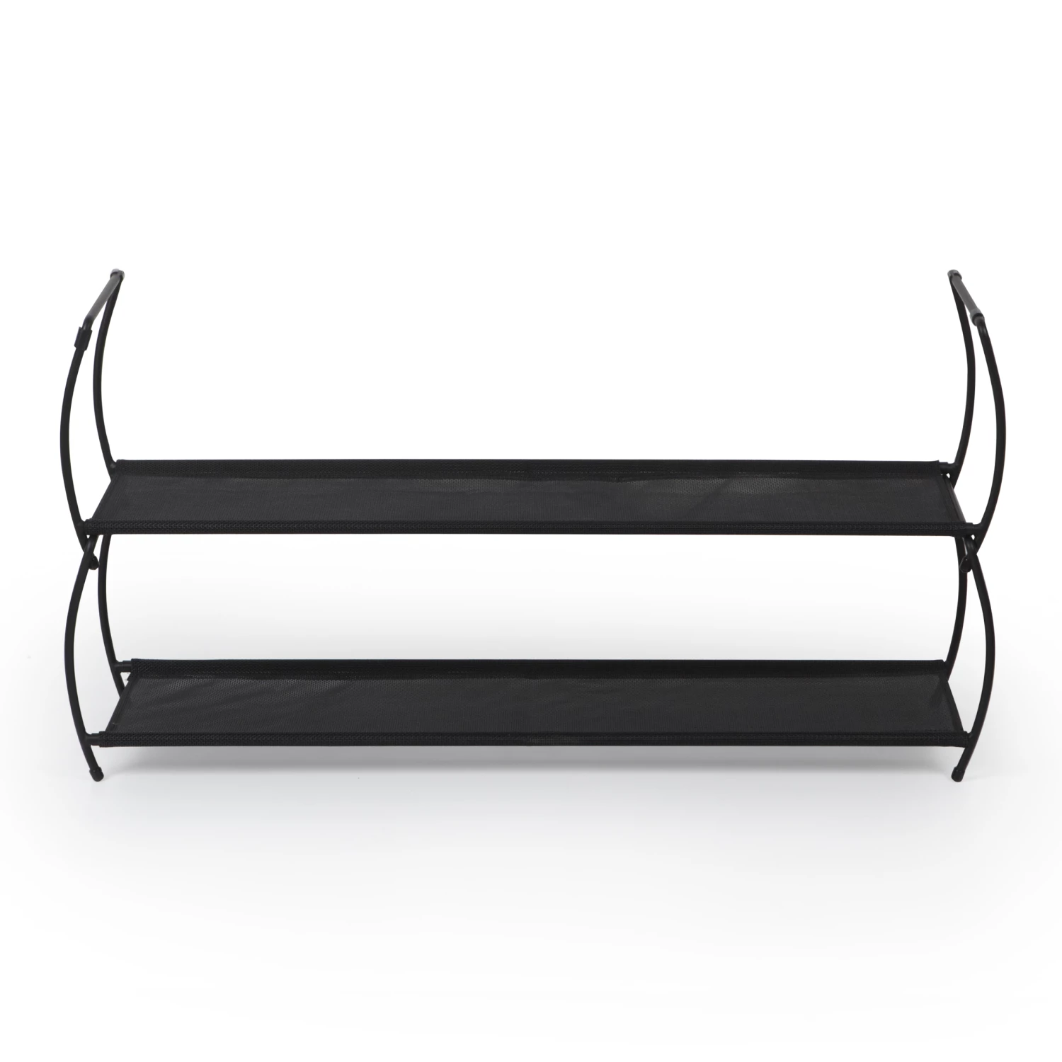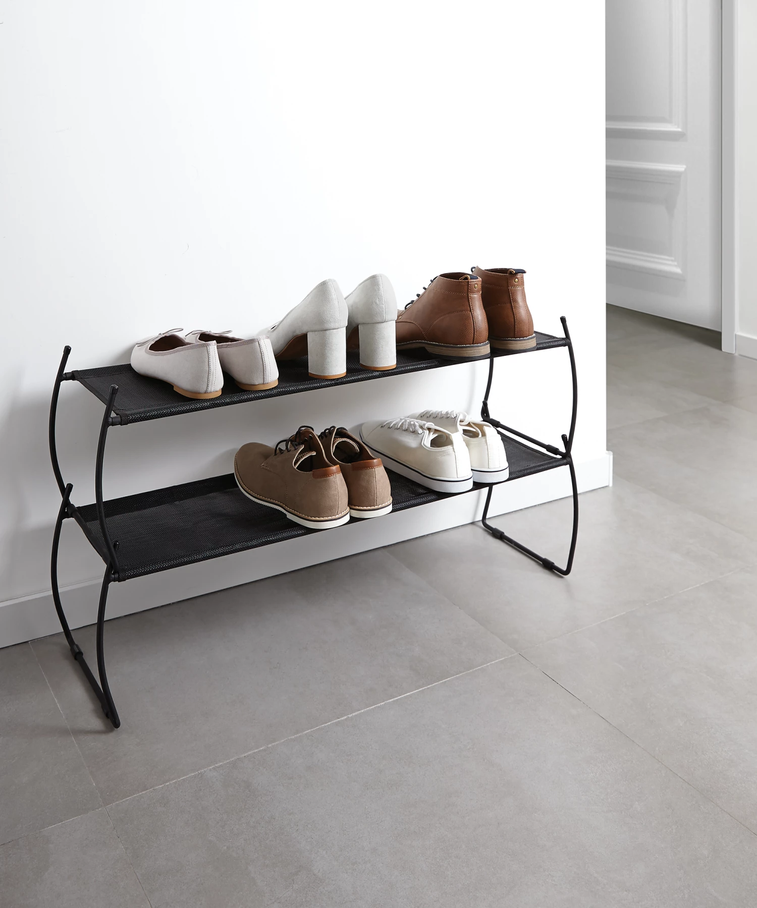 - Set of 2 stacking shoe rack shelves with metal frames and vinyl mesh